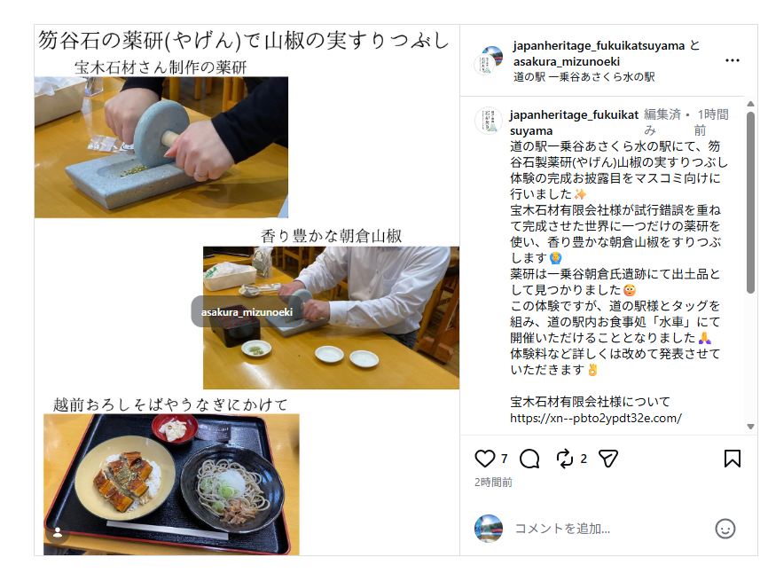 朝倉山椒を笏谷石の薬研でつぶし鰻を頂く 1/31スタート